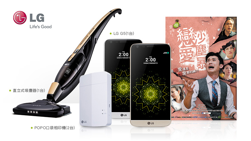 《戀愛沙塵暴》大獎 / LG G5手機*1台(顏色隨機) 、直立式吸塵器(含水箱功能)*1台 、POPO口袋 相印機*2(粉白雙色隨機出貨)