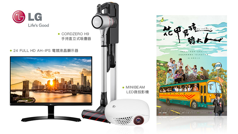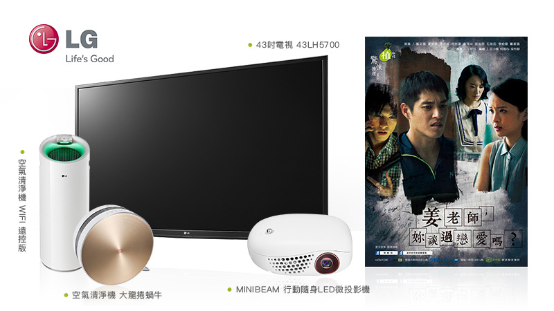 《姜老師,你談過戀愛嗎?》大獎 / 43吋電視 43LH5700 *1、空氣清淨機Wifi遠控版*1、空氣清淨機 大龍捲蝸牛 *1、Minibeam 行動隨身LED微投影機*1