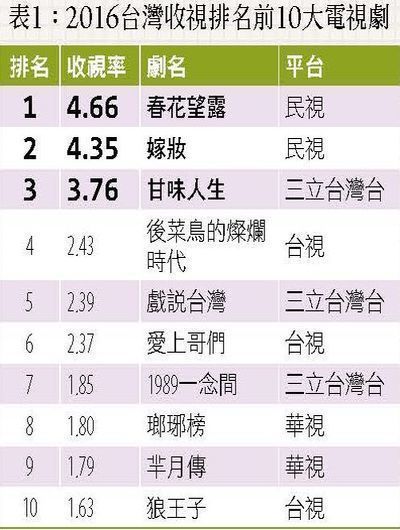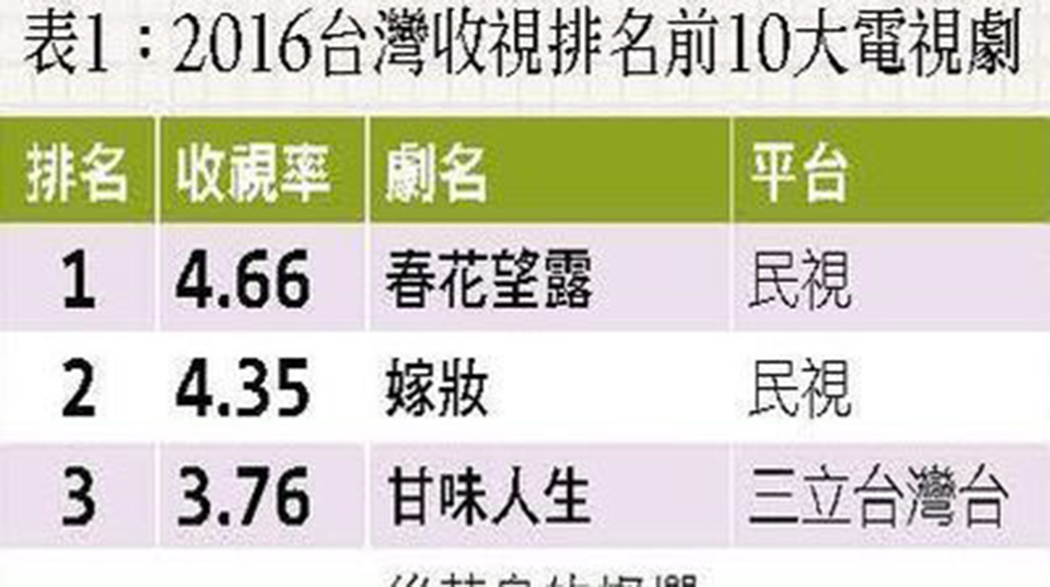 根據尼爾森收視率調查報告(參見表1),截至9月11日,2016年電視劇收視率排名前三的都是「鄉土劇」:民視八點檔鄉土劇《春花望露》排名第一,收視率高達4.66;排名第二的是《春花望露》上一檔的鄉土劇《嫁妝》,平均收視4.35;第三名的三立電視台八點檔鄉土劇《甘味人生》,收視達3.76。除了鄉土劇以外,以台視偶像劇《後菜鳥的燦爛時代》、《愛上哥們》成績最為亮眼。