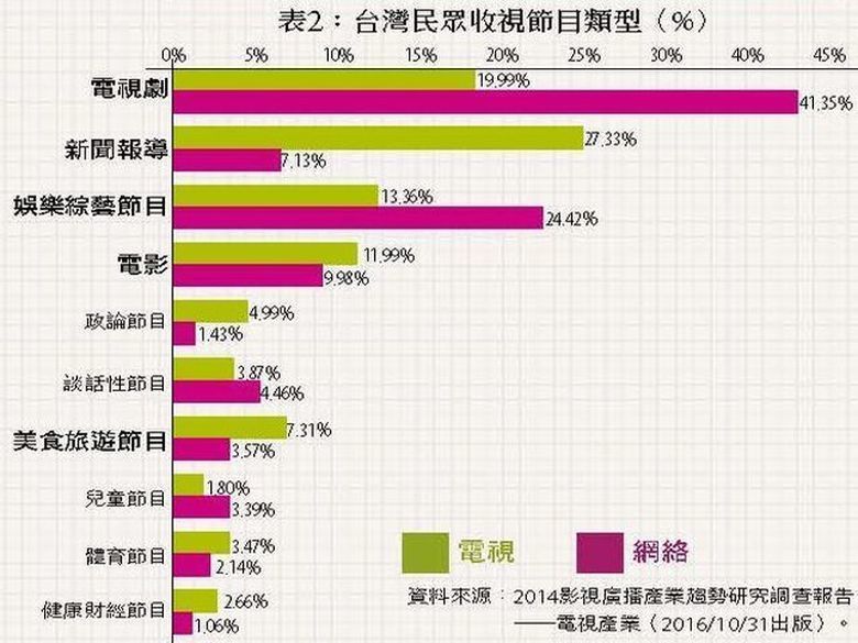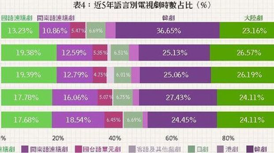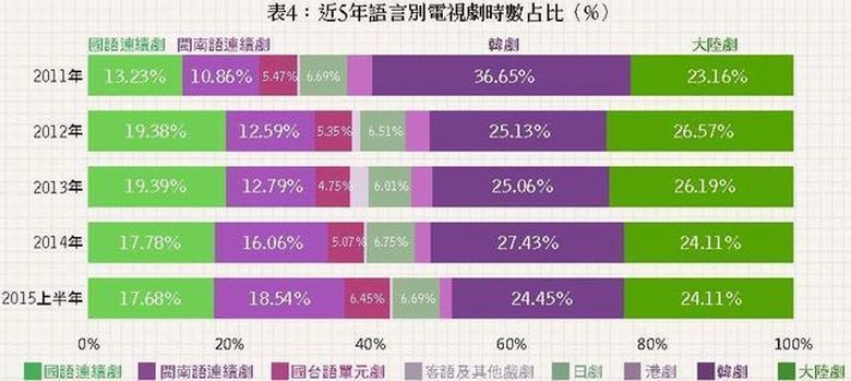 根據《2014影視廣播產業趨勢研究調查報告──電視產業》資料顯示(參見表4),2015年上半年中,台灣自製的國語連續劇、閩南語連續劇、國台語單元劇共占播出時數的42.76%,外來劇(包括日劇、港劇、韓劇、大陸劇)比例近年來都超過50%,也就是台灣有超過二分之一的電視劇都是其他國家的影視作品。