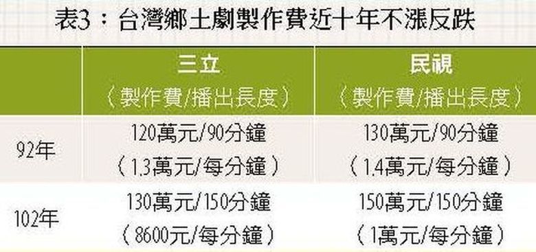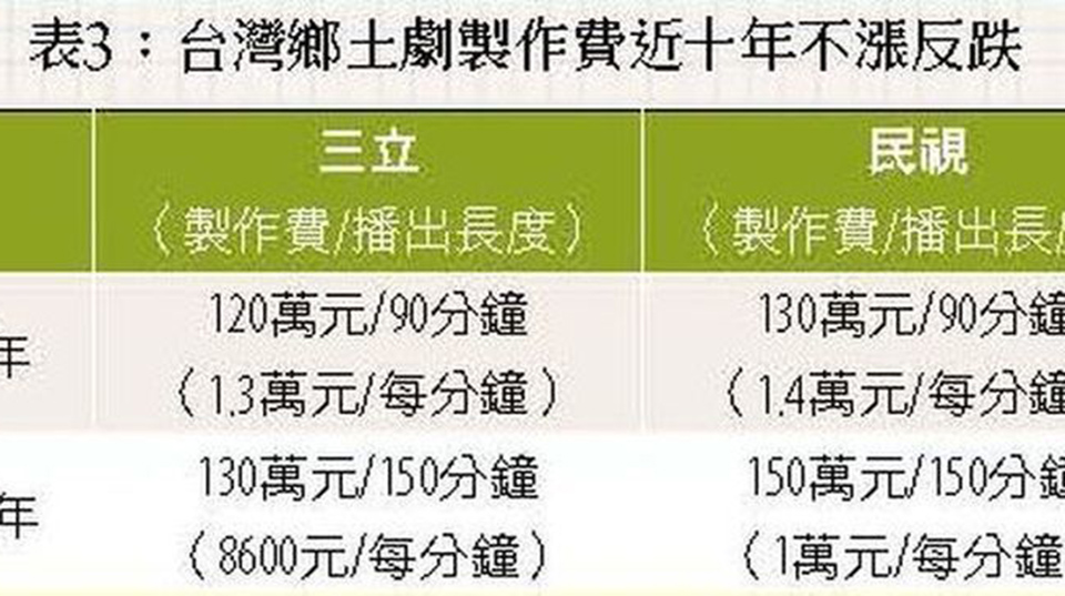 「有錢不一定能做出好戲」,可是「沒錢一定做不出好戲」,製作成本低是導致電視節目難看的主要原因。蔡東文指出,鄉土劇大約一集130萬,偶像劇平均一集約200萬元,250萬至300萬就能拍出一定質感。據「中國民國剪輯協會」資料顯示(參見表3),締造好口碑的《我可能不會愛你》一集210萬,台灣電視史上收視率最高的偶像劇《命中注定我愛你》一集300萬,《拜金女王》一集600萬已是高成本。