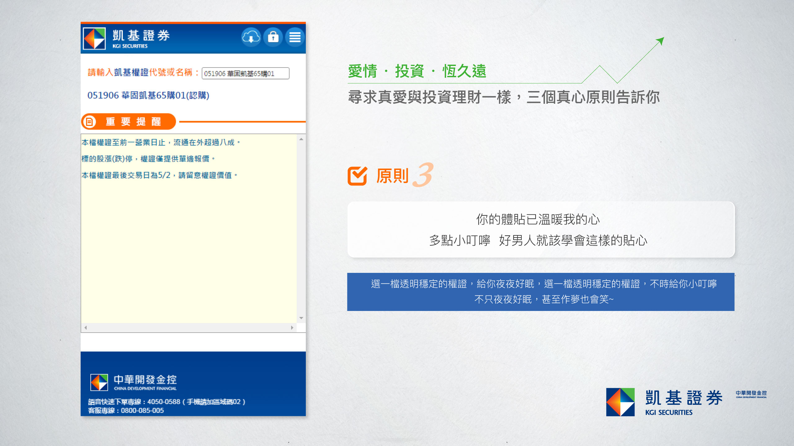 投資愛情就跟投資理財一樣,我們都希望投資到對的人,他能對你透明公開,毫不隱藏;也能說到做到,穩定踏實,不會讓承諾縮水變少。即日起至6月30日,趕快點選,測驗自己能否有辦法在愛情裡投資順利,就有機會拿好禮。是你善投資的最佳犒賞,也是預祝給你和對的人最棒的禮物。